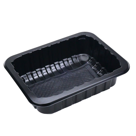 These trays are an excellent choice for displaying meats, fruits, and vegetables for retail sale. The durable, crack-resistant polypropylene trays are engineered for use with lidding films, and SimplyFresh™ Lidding Film is available in both stock and custom configurations to meet any packaging requirement. The tray’s black color provides great product presentation, and the integrated soaker pad helps ensure that products maintain their shelf appeal. This tray is a versatile option for supermarkets, butcher shops, delis, and more.